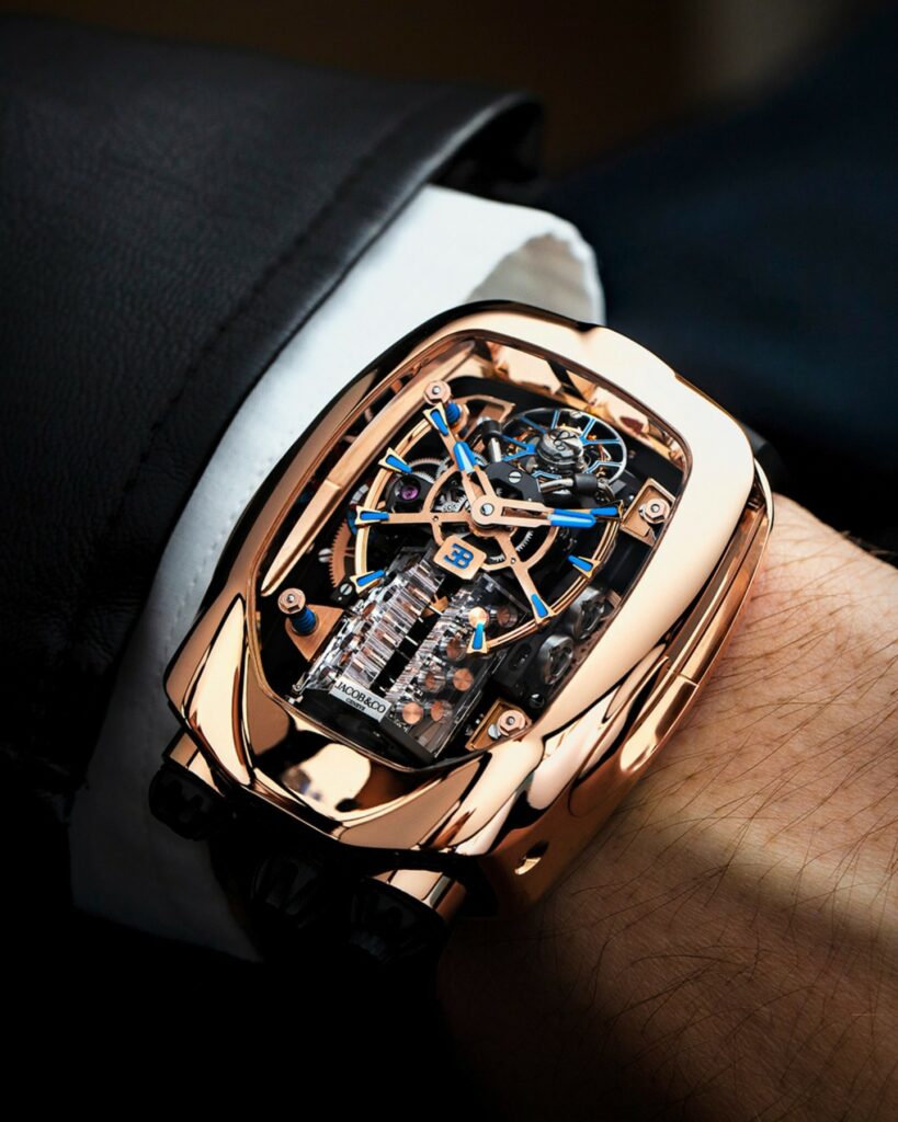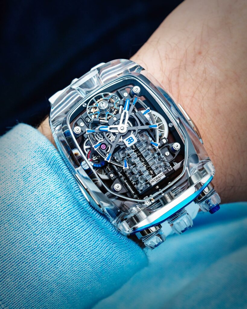 There are several iterations of the luxury timepiece since its creation, but the Bugatti Chiron Blue Sapphire Crystal is by far the most magnificent. It features an electric blue sapphire case made completely out of sapphire crystal. A daunting feat in watchmaking. This electric blue sapphire case takes 80 hours to cut and polish, which makes it incredibly hard to manufacture. The exceptional mechanics of the Bugatti watch together with its stellar craftmanship makes it one of the most complex, yet top-notch wristwatch for men ever manufactured.