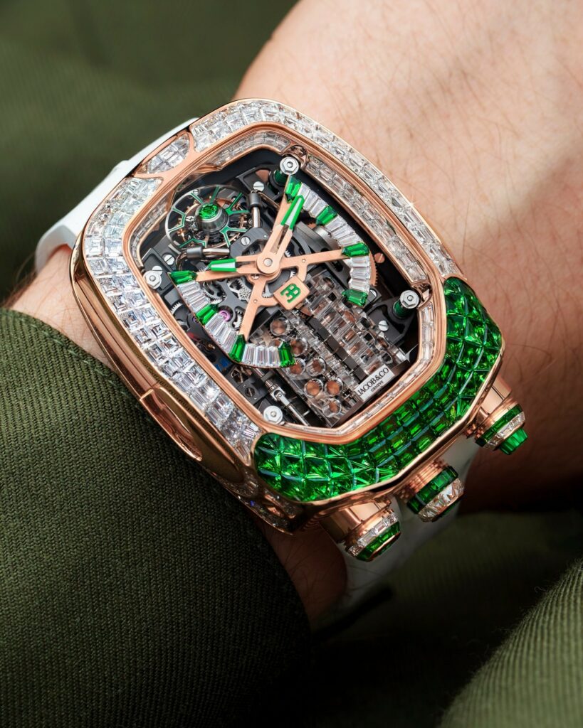This edition of Bugatti Chiron Tourbillon features a case covered in over 425 custom-made green tsavorites and diamonds. A lavish and utterly breath-taking design.