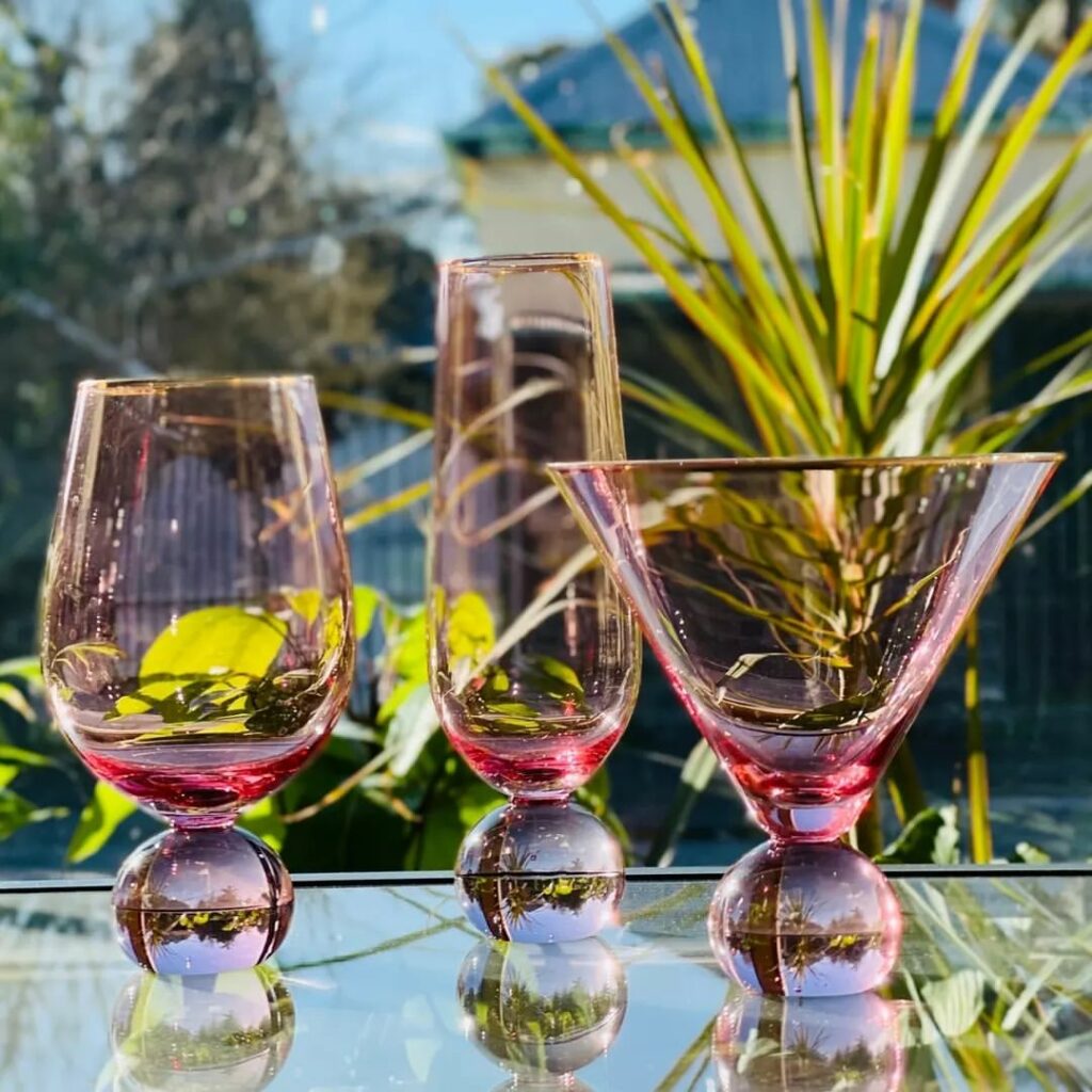 This elegant stemware is from The Source Home Owners and it is truly breathtaking. Its transparent, warm, pink tone is riveting and oozes nothing short of vintage sophistication. The set is a wineglass, flute and martini coupe.